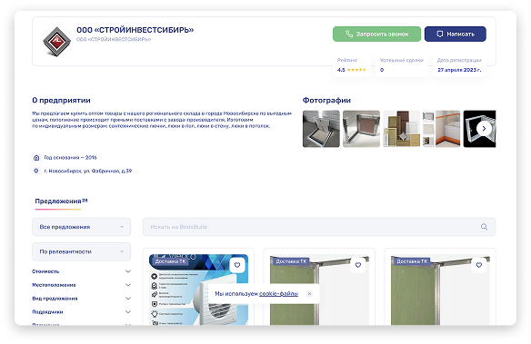 Это готовая страница вашего бизнеса с каталогом товаров и услуг, контактами, рейтингом и возможностью оформлять заказы.  Витрина заменит или дополнит ваш интернет-магазин – делитесь ссылками на товары и категории, принимайте заказы прямо на платформе. Удобные фильтры и поиск помогут клиентам легко найти вашу компанию среди сотен поставщиков. Посетители смогут искать товары только внутри вашего каталога и не увидят там предложений от конкурентов.